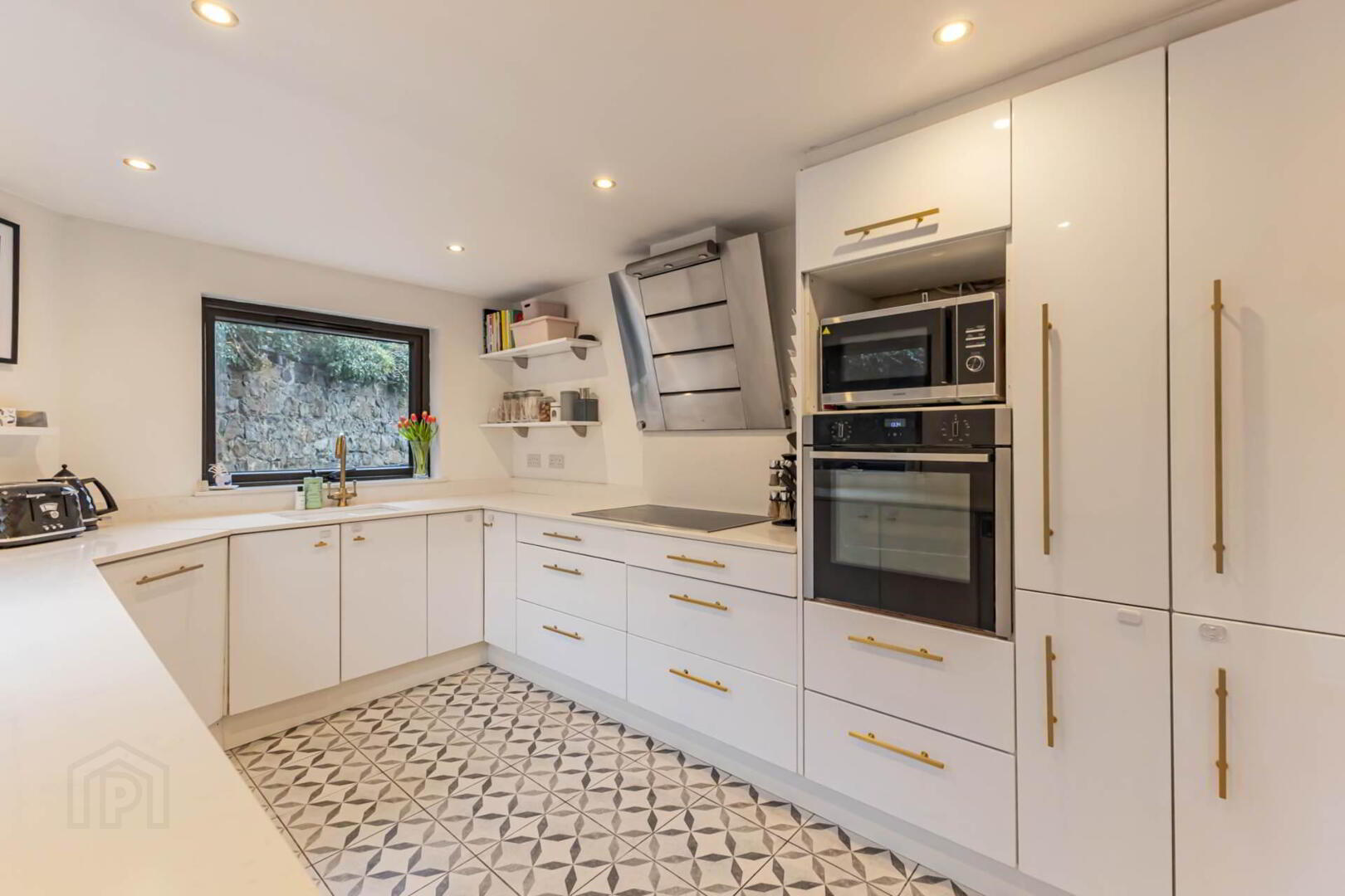 Tiled floor. Range of high and low level cupboards in white gloss. `Franke` large and small bowl sink unit with mixer tap. Integrated dishwasher and fridge freezer. Plumbed for washing machine. Built-in oven. 5 ring touch hob and extractor fan over in stainless steel. Downlighters.