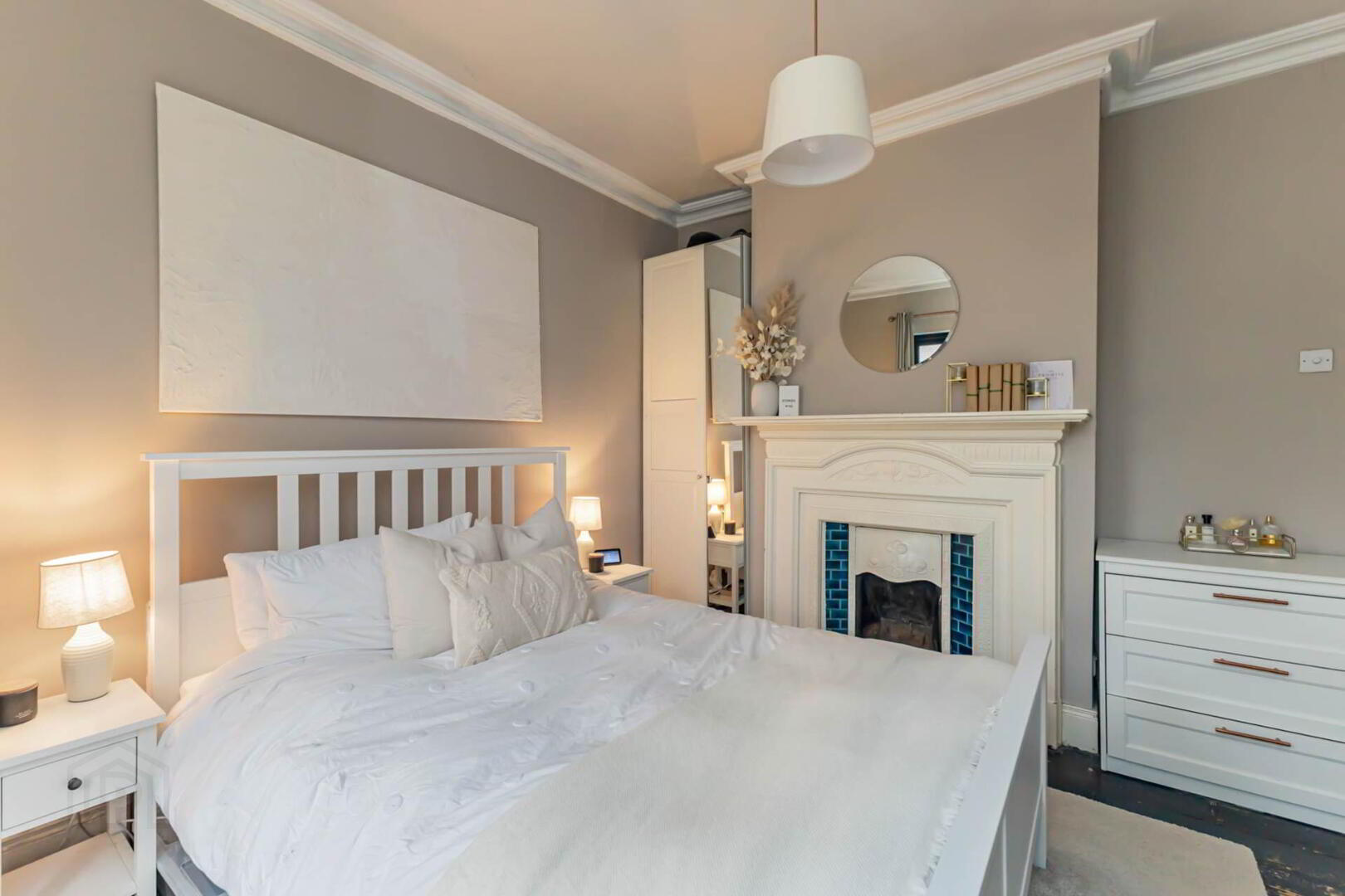 Cast iron fireplace with tiled hearth (not open). Corniced ceiling.