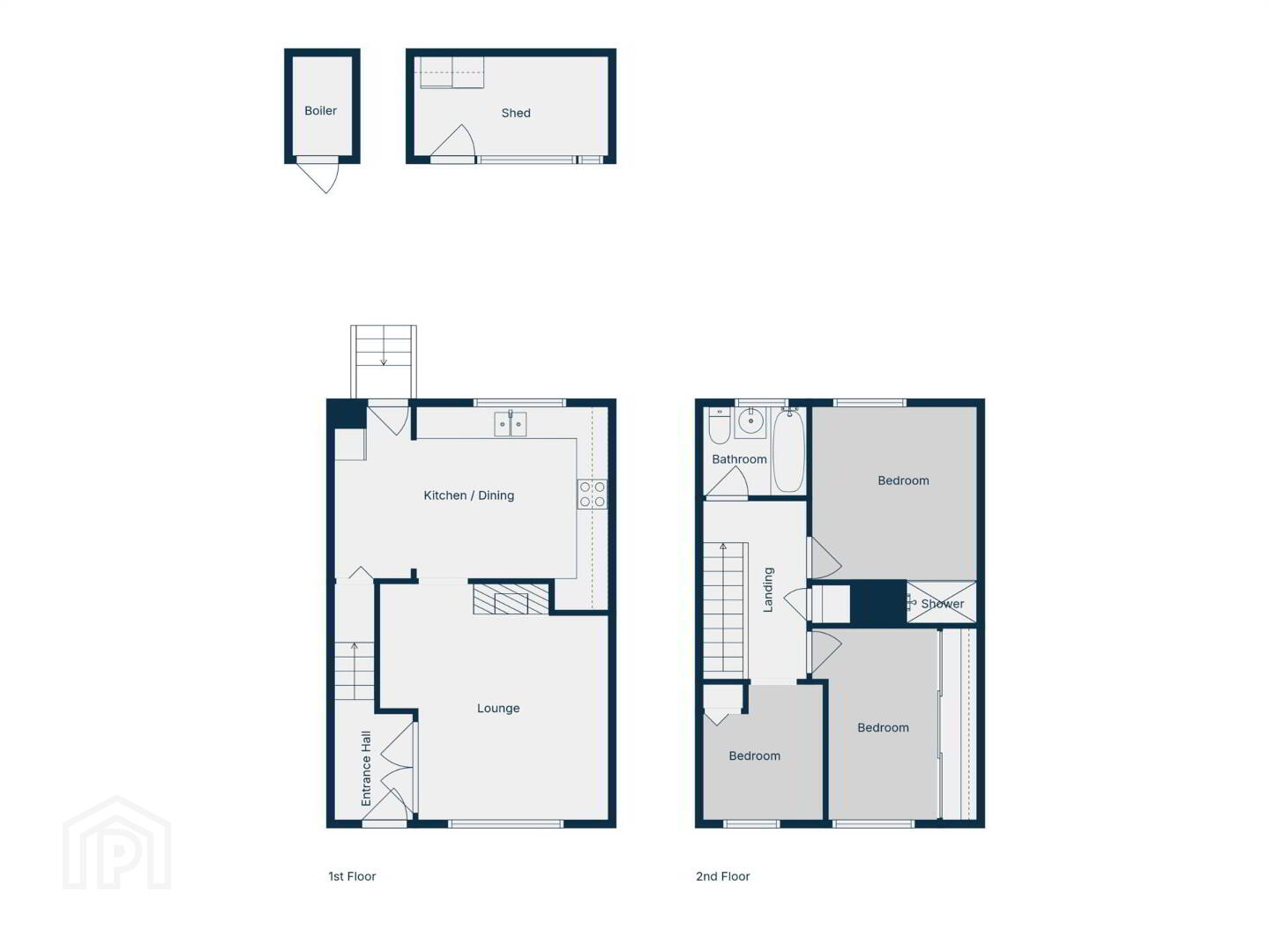First floor: 3 Bedrooms; Bathroom.
