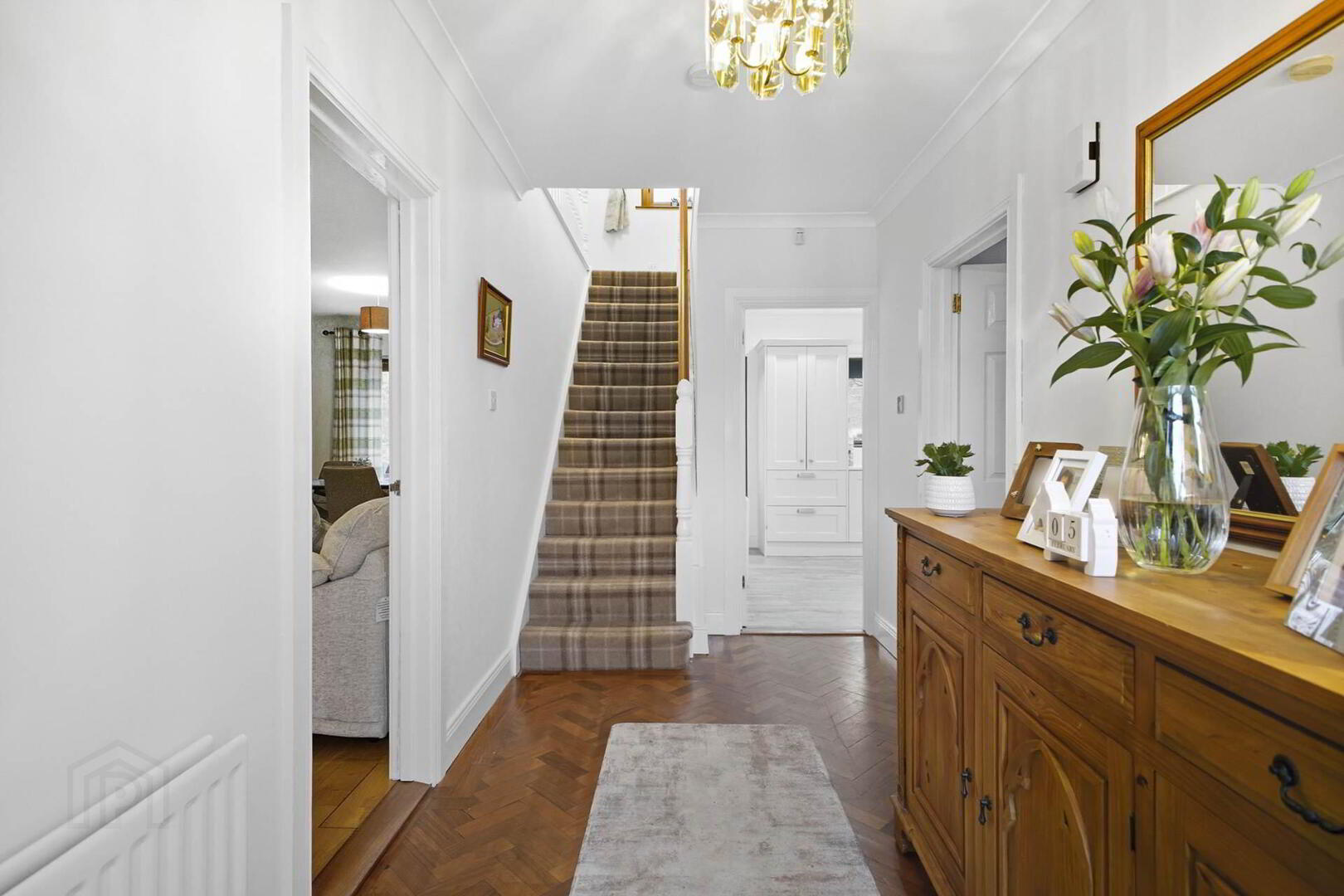 PVC panelled door with glazed side panels and fan light over. Herringbone hardwood flooring. Coved ceiling.