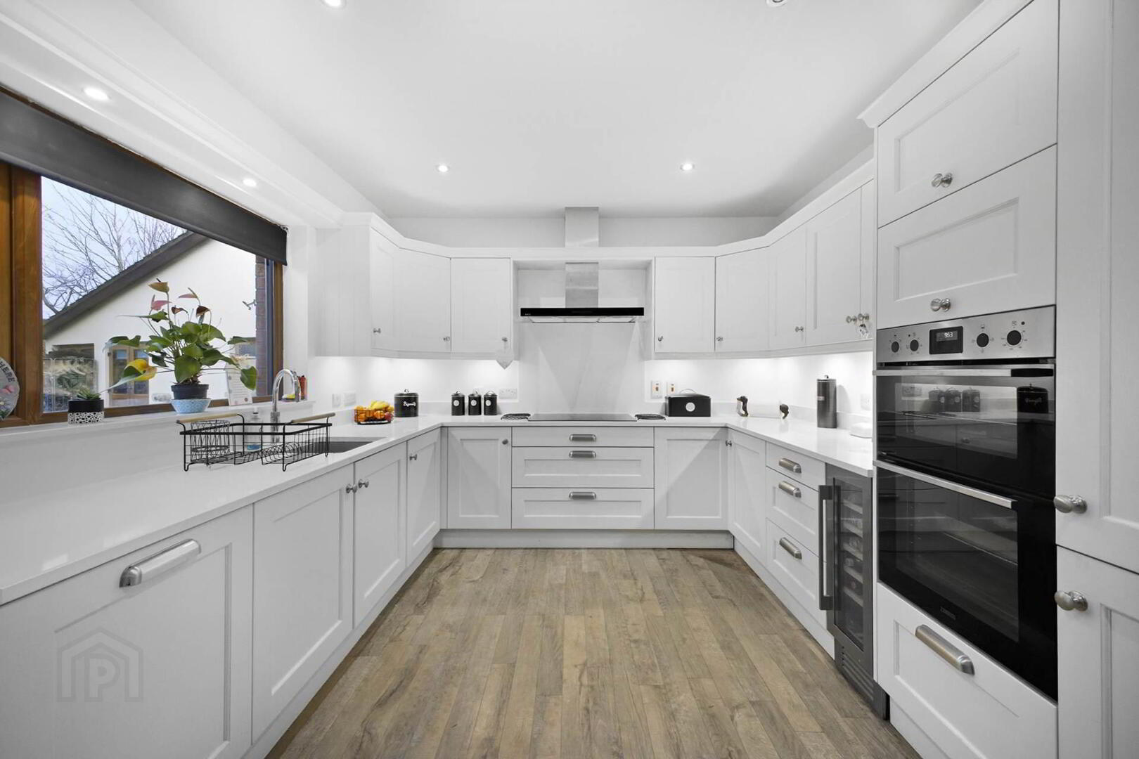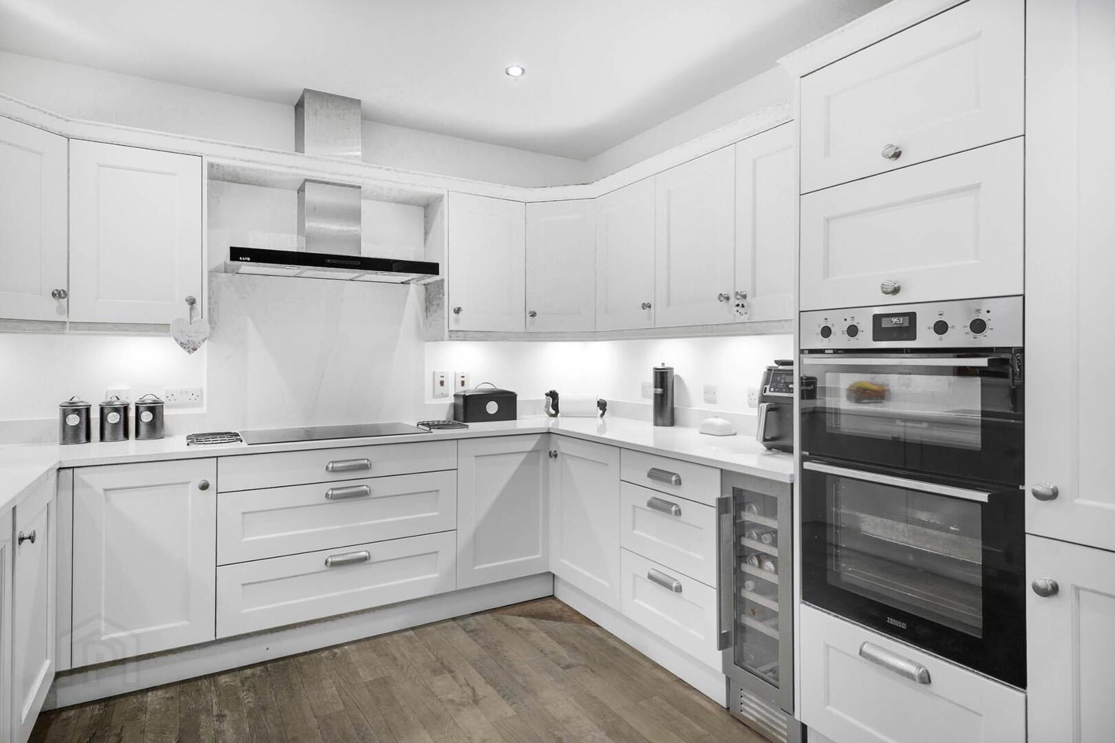 Refitted Wakefield Kitchen to include high and low level units in cream. Large 4 ring ceramic hob with stainless steel extractor unit over. Zanussi double oven. Integrated dishwasher. Wine fridge. Stone worktop with upturns and splashback. Underlighting.