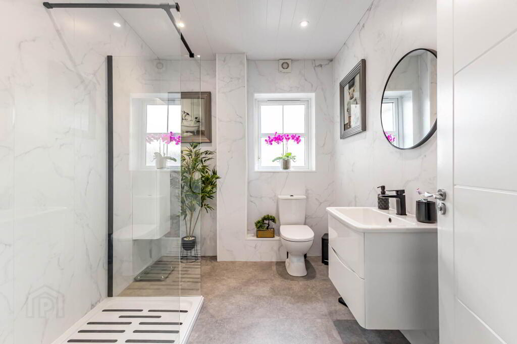 SHOWER ROOM Large shower enclosure with drench head shower and hose attachment; floating vanity wash hand basin with mixer tap and drawers below; low flush w.c. Panelled walls and ceiling. Downlighters.