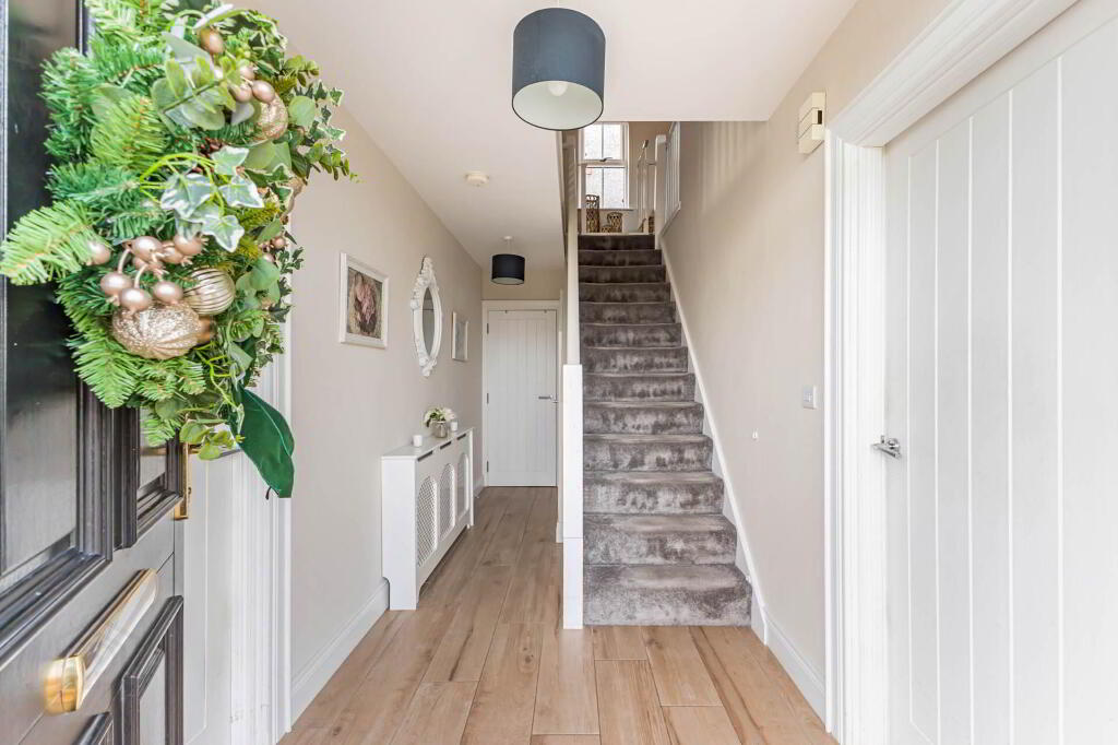 RECEPTION HALL Entrance door with glazed top and side panels. Tiled floor. Understairs storage.