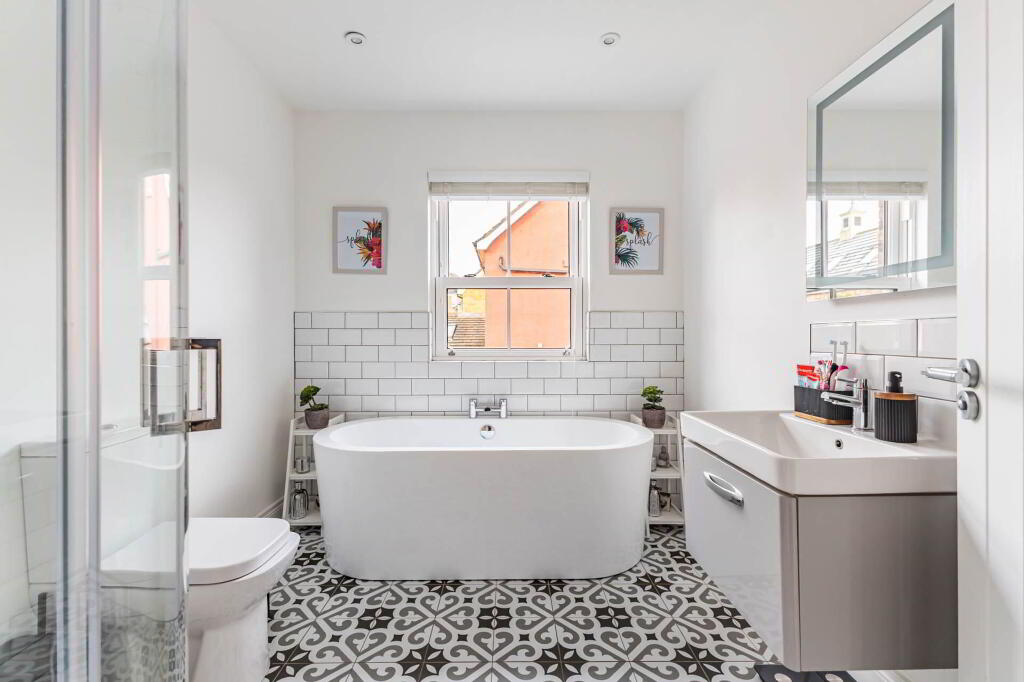 BATHROOM White suite to include free standing bath with centred mixer tap; fully tiled corner shower enclosure; floating vanity wash hand basin with mixer tap and drawer below; and low flush w.c. Part tiled walls. Tiled floor. Downlighters.