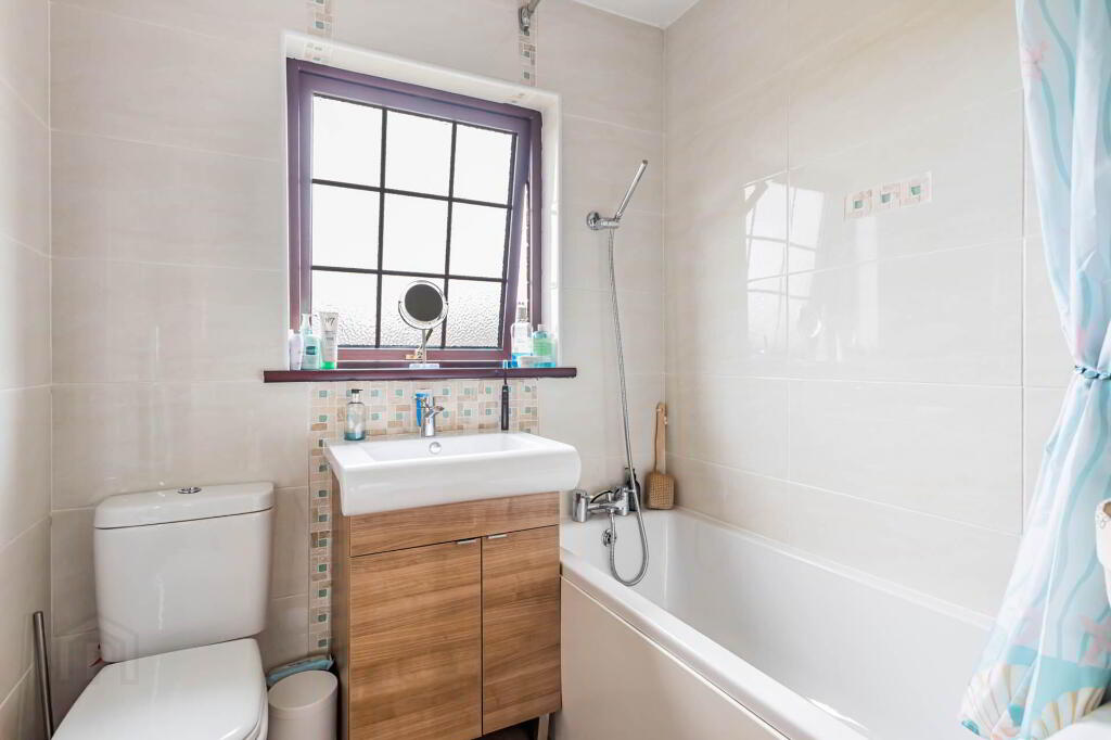 BATHROOM Modern white suite comprising bath with mixer tap and shower attachment; vanity wash hand basin with mixer tap and cupboards below; low flush w.c. Chrome fitted towel rail. Fully tiled walls.