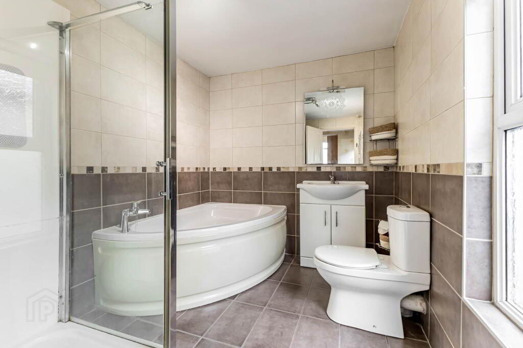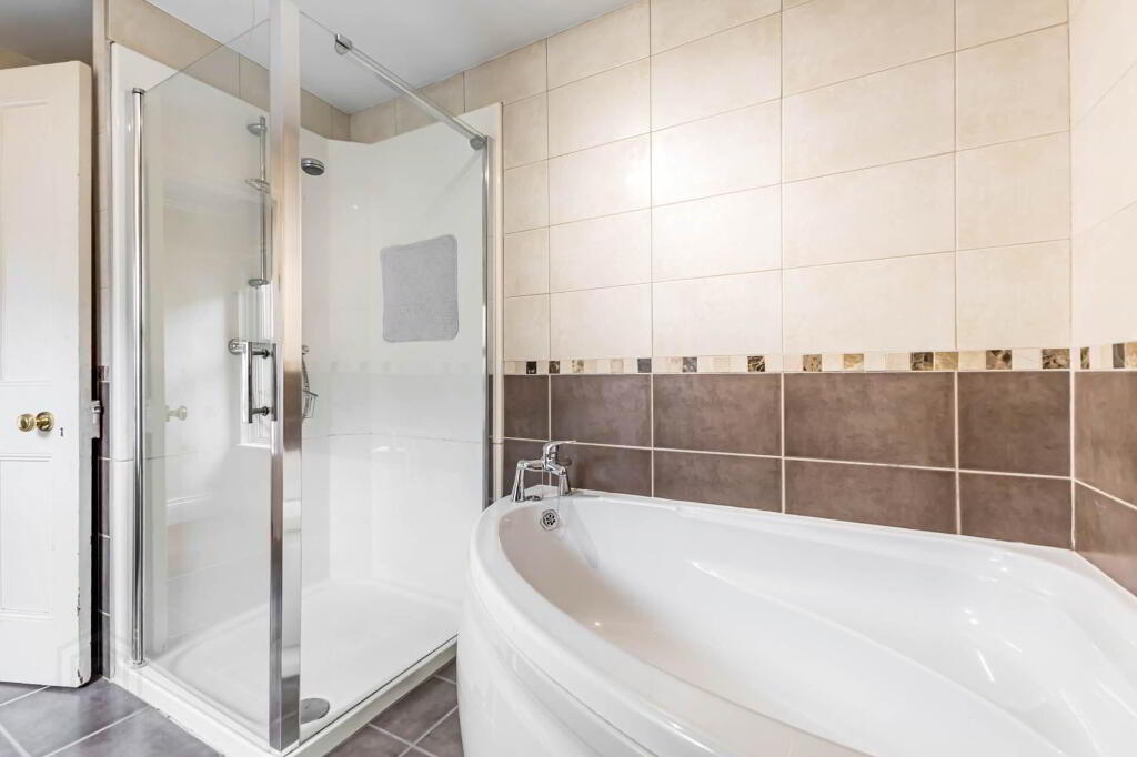 BATHROOM - 3.28m (10'9") x 2.12m (6'11") Corner bath with mixer tap; shower cubicle; vanity wash hand basin with mixer tap; and low flush w.c. Tiled walls and floor. Chrome heated towel rail. Built-in hotpress.