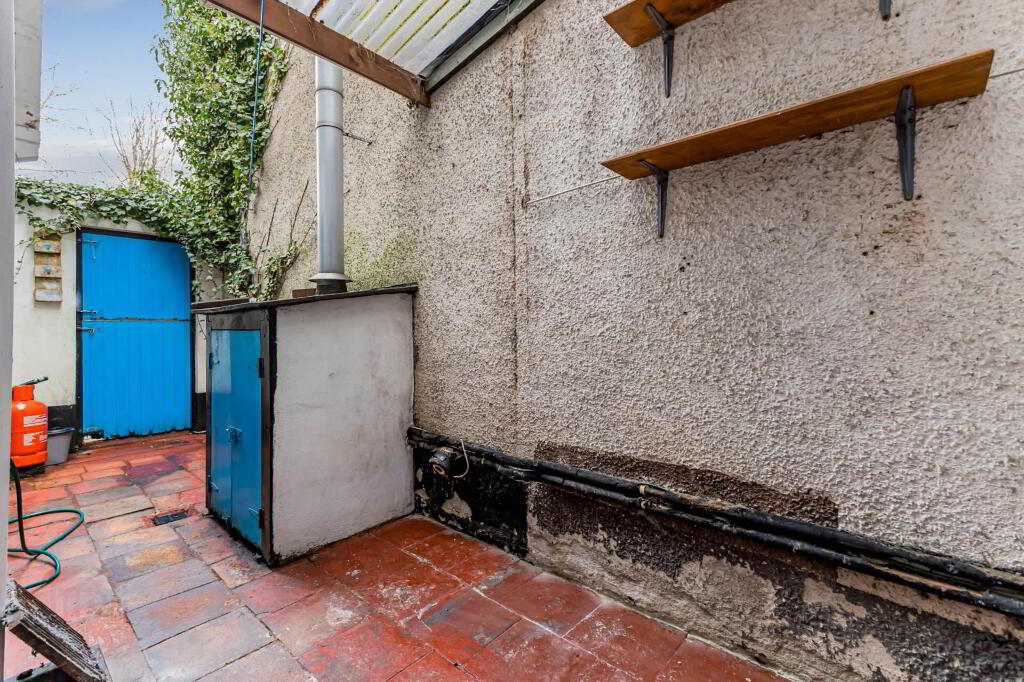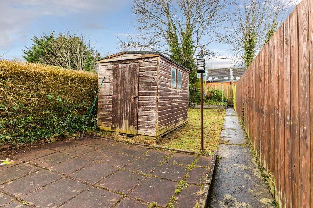 Outside: Brick paved parking space to front and patio area. Enclosed, part covered rear yard. Light. Tap. Boiler house. Pedestrain right of way. Good size rear garden in lawn with patio areas. Hedge and timber fence surround.
