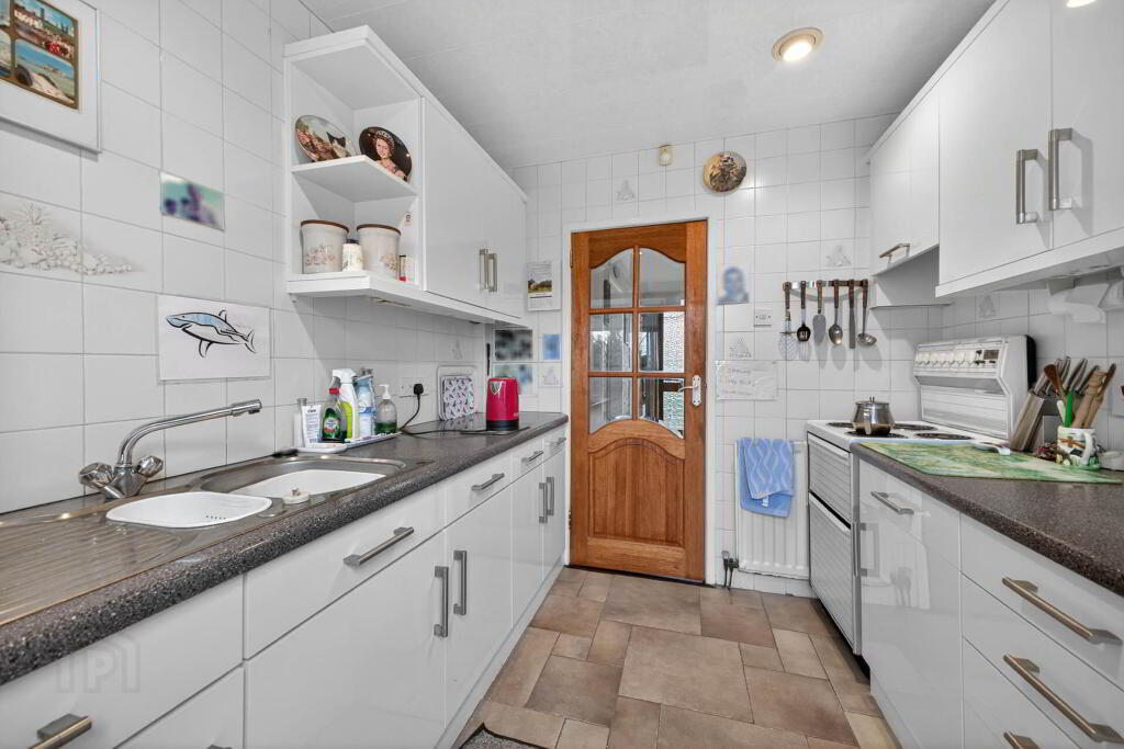 KITCHEN - 2.63m (8'8") x 2.41m (7'11") Range of high and low level cupboards in white gloss. Extractor unit. Large and small bowl single drainer stainless steel sink unit with mixer tap. Tiled walls and tiled floor. uPVC double glazed rear door.
