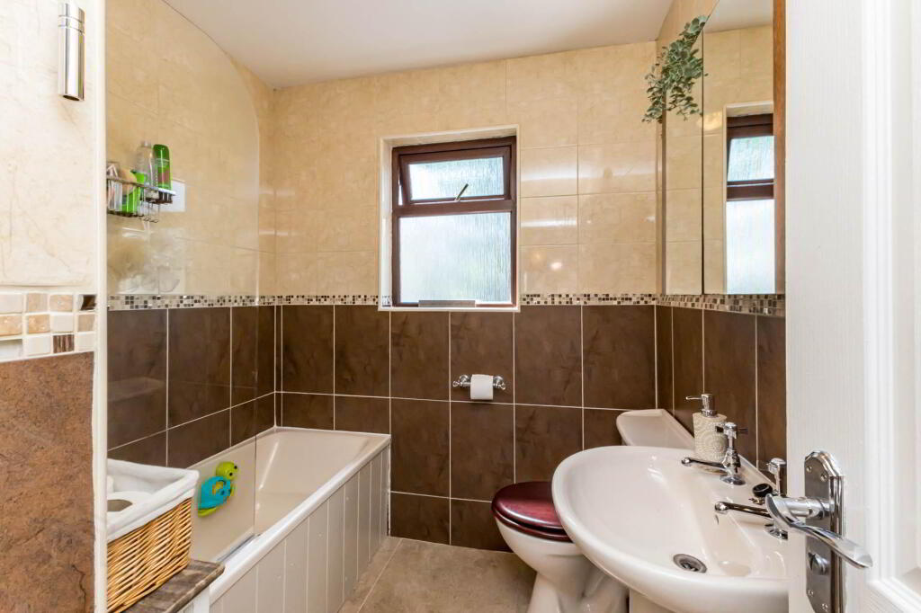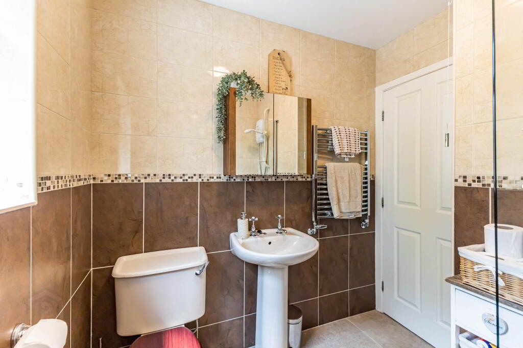 BATHROOM Cream suite to include bath with electric shower over and shower screen; pedestal wash hand basin; and w.c. Fully tiled walls. Tiled floor. Heated towel rail.