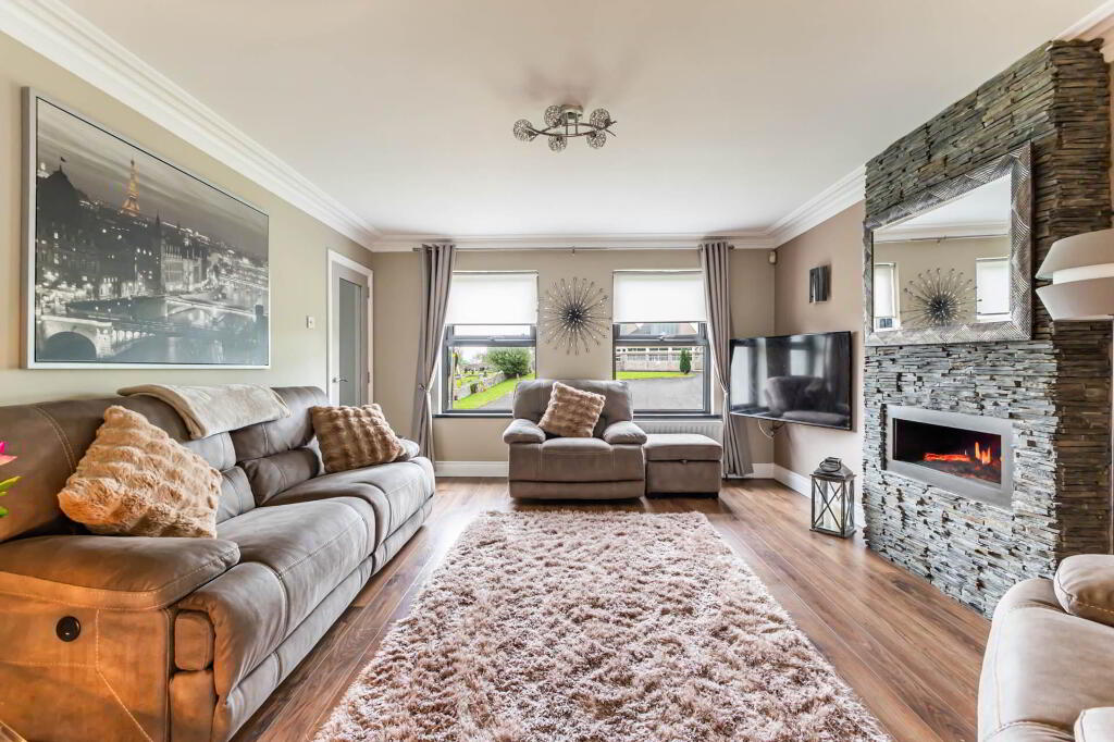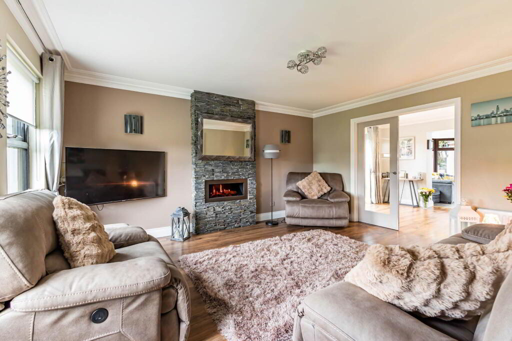 LOUNGE - 4.71m (15'5") x 3.99m (13'1") Corniced ceiling. Laminate wooden floor. Feature electric fireplace within slate tiled floor to ceiling surround.