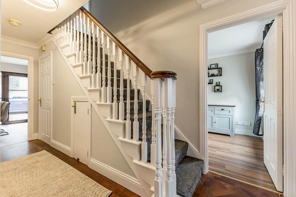 RECEPTION HALL Composite part glazed entrance door. Parquet wooden floor. Corniced ceiling. Understairs storage cupboard.