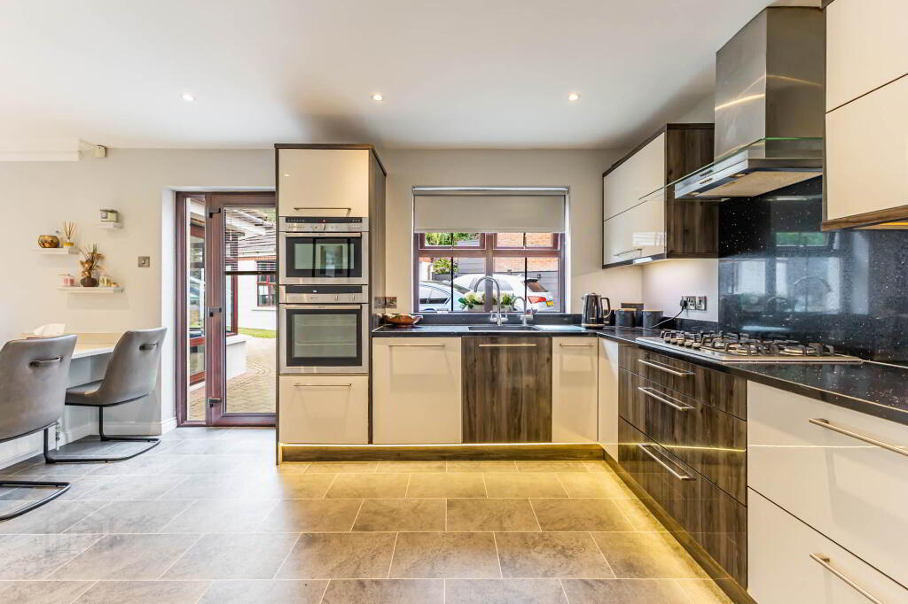 DINING ROOM open plan to KITCHEN - 8.66m (28'5") x 2.88m (9'5") KITCHEN Extensive range of units in gloss finish with quartz worktops. `Blanco` sink unit with mixer tap. Built-in 5 ring gas hob and extractor unit over. `Neff` built-in oven and microwave. Integrated dishwasher. Fitted breakfast table. Vinyl tiled floor. Downlighters.
