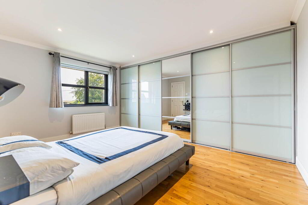 PRINCIPAL BEDROOM - 4.53m (14'10") x 3.35m (11'0") Wall length fitted wardrobes with sliding doors. Oak flooring. Coved ceiling. Downlighters.