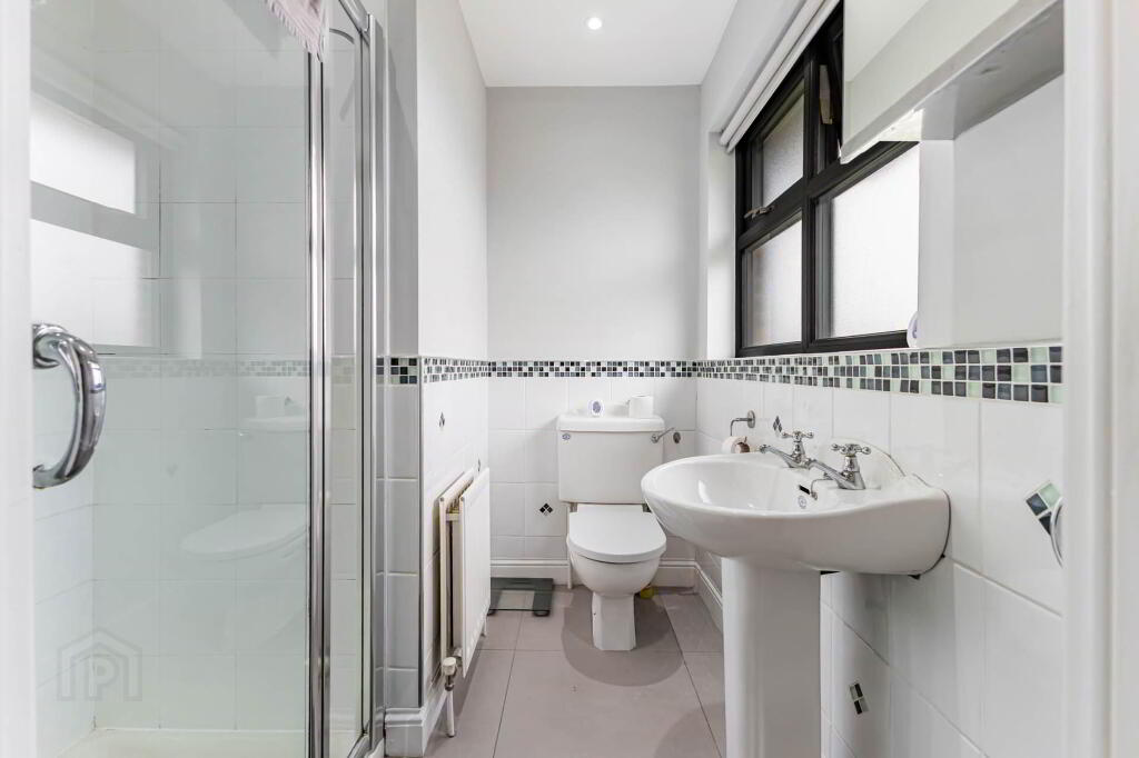 ENSUITE SHOWER ROOM Fully tiled shower enclosure; pedestal wash hand basin; low flush w.c. Tiled floor. Part tiled walls. Downlighters.