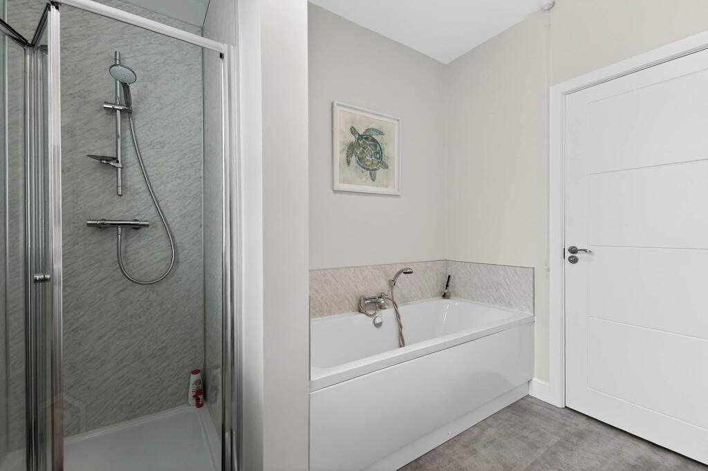 BATHROOM White suite to include panelled bath with mixer tap and telephone shower attachment; separate shower enclosure with panelled walls; pedestal wash hand basin with mixer tap; and w.c. Heated towel rail. Storage cupboard with radiator. Extractor fan. Laminate wooden floor.