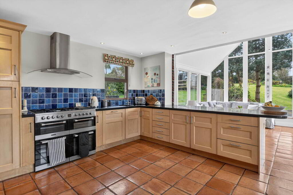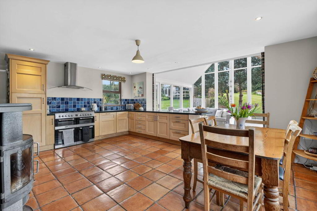 Range of `Shaker` style units with granite worktops. Circular stainless steel sink unit with mixer tap. Part tiled walls. Breakfast bar. Integrated dishwasher. Range style cooker with extractor unit over. Downlighters. Terracotta tiled floor. Feature log burning stove. Open to:-