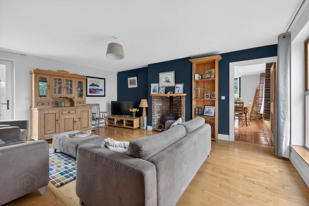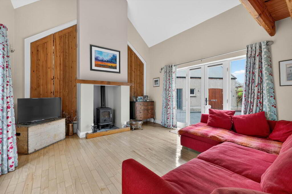 High vaulted ceiling. `French` doors. Maple wooden flooring. Log burning stove on stone hearth with pine beam mantle. Feature tall windows either side of chimney breast with bespoke fitted pine shutters. 5 amp lighting sockets.
