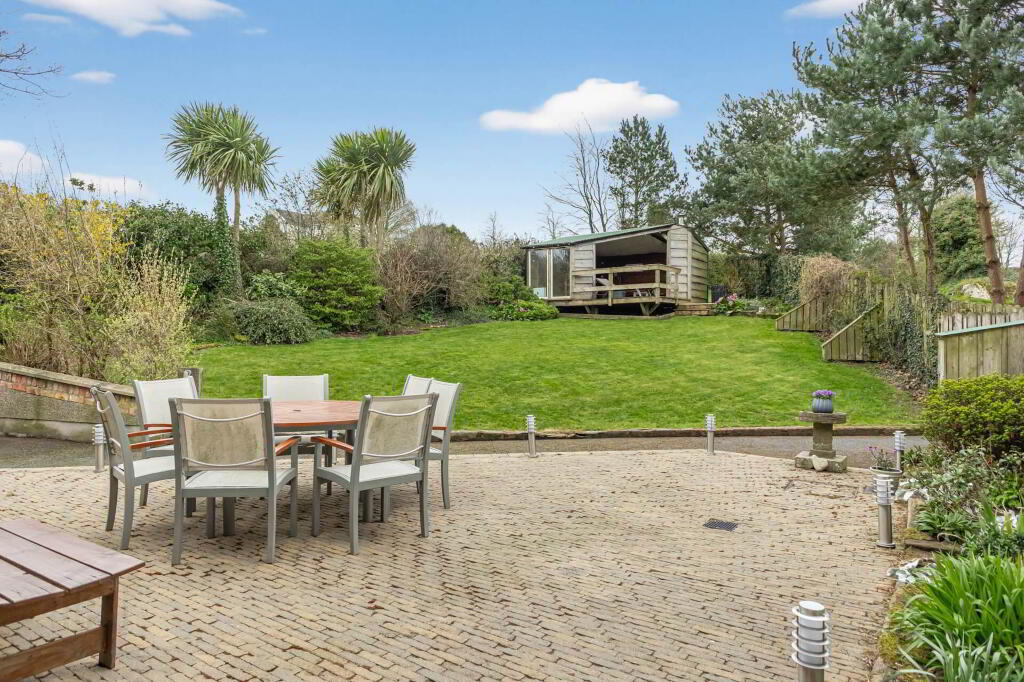 A cobble-paved patio is perfectly positioned to capture afternoon and evening sun, making it ideal for outdoor dining. A standout feature is the elevated larch-clad garden cabin, complete with log-burning stove, power, and lighting offering a unique space for entertaining, relaxation, or home working.