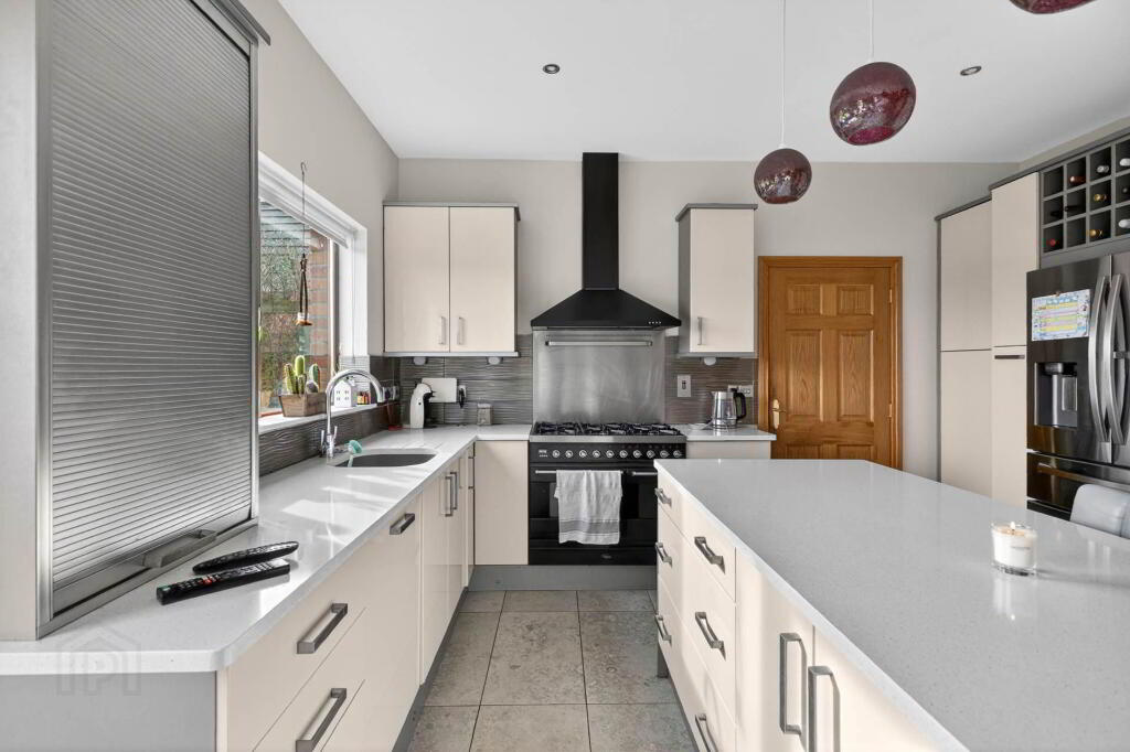 KITCHEN/DINING open plan LIVING ROOM - 9.04m (29'8") x 3.56m (11'8") Extensive range of units with silestone quartz worktops and sink unit with mixer tap. Integrated dishwasher. Range style cooker with extractor unit over. Island unit with silestone quartz worktop, cupboards, drawers and breakfast bar. Part tiled walls. Tiled floor. Downlighters. uPVC double glazed `French` doors with glazed side panels either side.