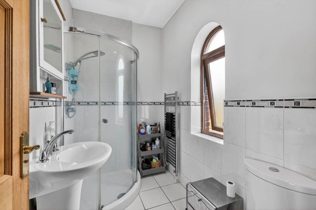 ENSUITE SHOWER ROOM Fully tiled shower cubicle; pedestal wash hand basin with mixer tap; and low flush w.c. Tiled floor and part tiled walls. Downlighters. Heated towel rail.