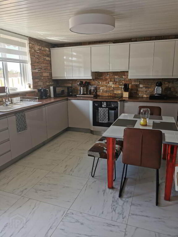 KITCHEN - 5.21m (17'1") x 3.87m (12'8") Range of high and low level units in high gloss. Large and small bowl sink unit with mixer tap. 4 ring ceramic hob. Built-in oven. Integrated fridge and washing machine. Part tiled walls. Tiled floor. PVC rear door.