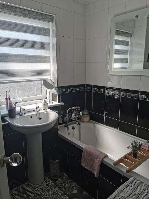 BATHROOM White suite to include tile panelled bath with mixer tap and telephone shower attachment; pedestal wash hand basin; and low flush w.c. Fully tiled walls. Tiled floor. Panelled ceiling.