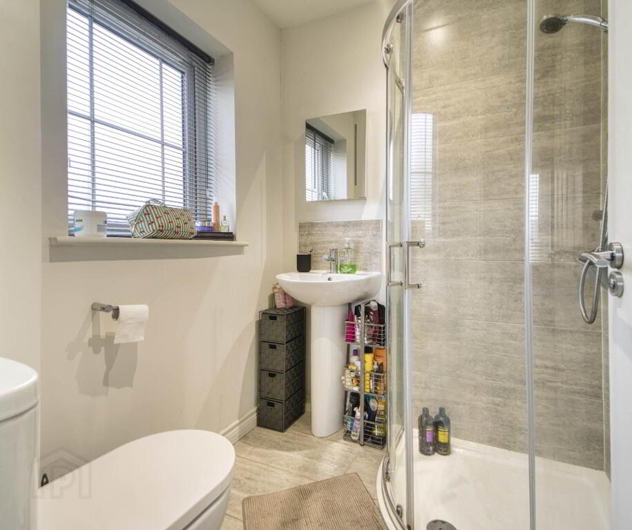 ENSUITE SHOWER ROOM - 1.81m (5'11") x 1.76m (5'9") to include corner shower enclosure; pedestal wash hand basin with mixer tap; and low flush w.c. Part tiled walls. Tiled floor.