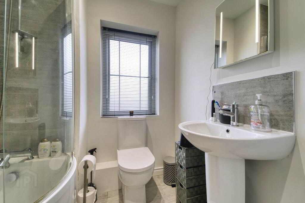 BATHROOM White suite to include shower/bath with mixer tap and shower attachment, and shower screen; pedestal wash hand basin with mixer tap; and w.c. Part tiled walls. Tiled floor. Extractor fan.
