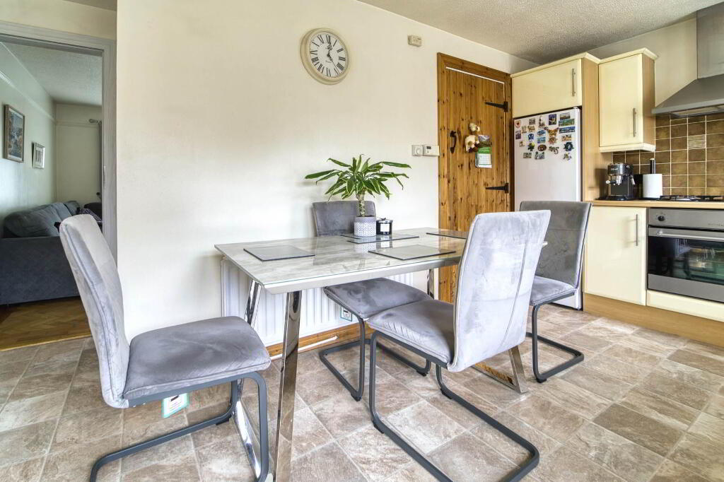 KITCHEN/DINING AREA - 4.79m (15'9") x 2.96m (9'9") Range of high and low level cupboards in gloss finish. Built-in oven, 4 ring gas hob and extractor fan in stainless steel. Plumbed for washing machine. Part tiled walls. Understairs storage/cloaks cupboard with gas boiler. uPVC double glazed rear door.