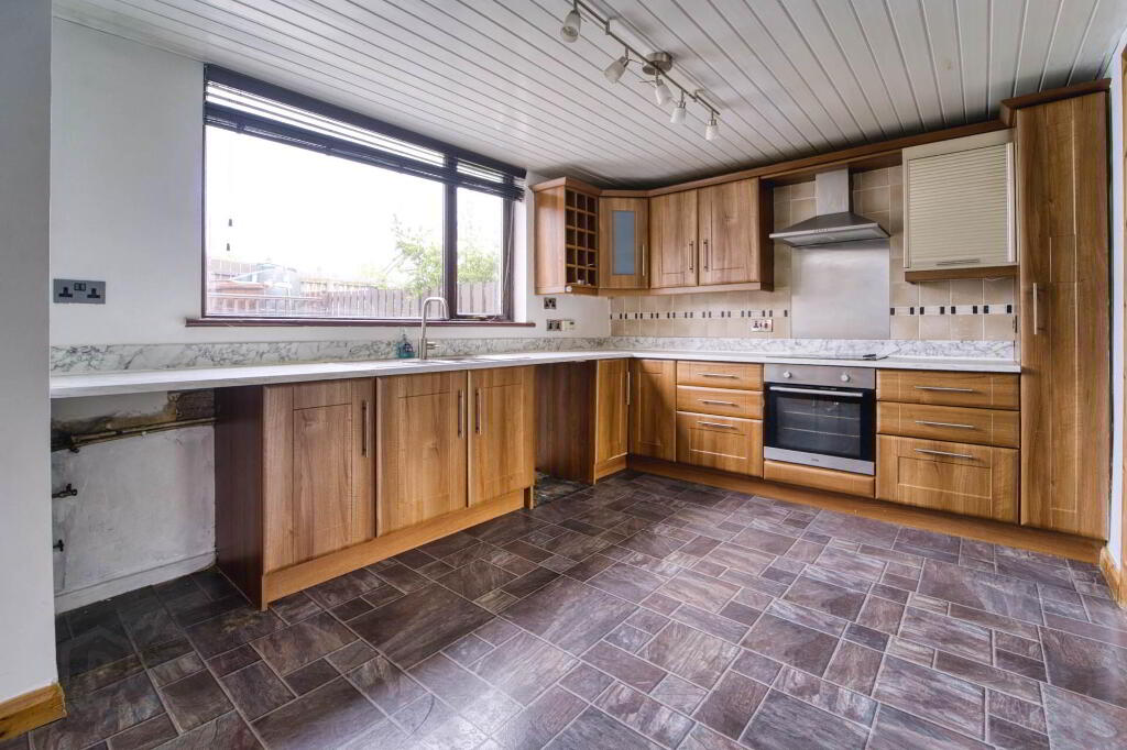 KITCHEN/DINING AREA - 5.85m (19'2") x 3.14m (10'4") Range of high and low level cupboards. Large and small single drainer stainless steel sink unit with mixer tap. Built-in oven, 4 ring hob and extractor fan over. Plumbed for washing machine. Breakfast bar. Understairs storage cupboard.